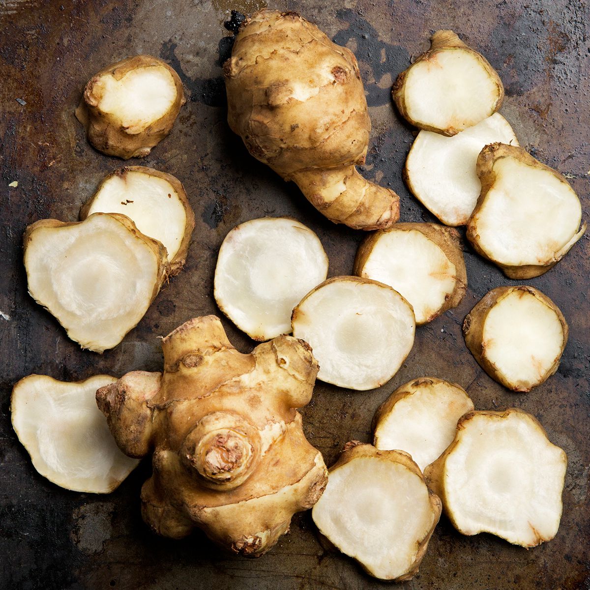 Sunchokes are a tuber related to sunflowers with an artichoke-like flavor and a water chestnut texture. When served raw in salads or as a crudite, they will be crisp, juicy, mild and sweet and stand up well to pre-dressing. They are wonderful sliced thin and pan-sauteed in olive oil or butter or oven- roasted in chunks. Roasted sunchokes are sweet with creamy interiors and a very light chestnut-ty flavor. They also make lovely purees.