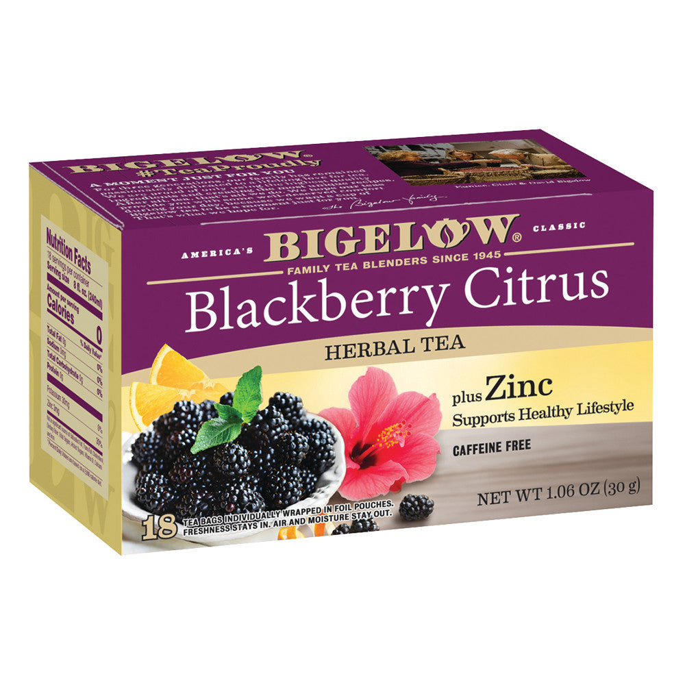 Zinc is going in popularity for its health benefits. Add it to a soothing herbal blend as that's all the mo-TEA-vation customers will need to pick up a pack of Bigelow Blackberry Citrus Herbal Tea. Since 1945 ,Bigelow has brewed signature specialty blends customers can't get enough of. Tangy blackberry and bright citrus, makes a flavorful Zinc rich blend that fits perfectly with today's health trends. The recognizable branding attracts attention while call outs like Zinc appeals to health conscious customers.