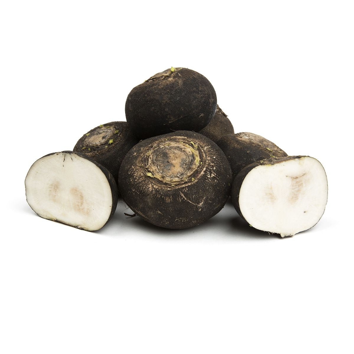 Black radishes have a spicy, pungent flavor; peel to tame the heat. Great in soups and stir fries, braised or in stews. Cut into matchstick or shred into a bitter green salad tossed with a sweet rice wine vinaigrette.
