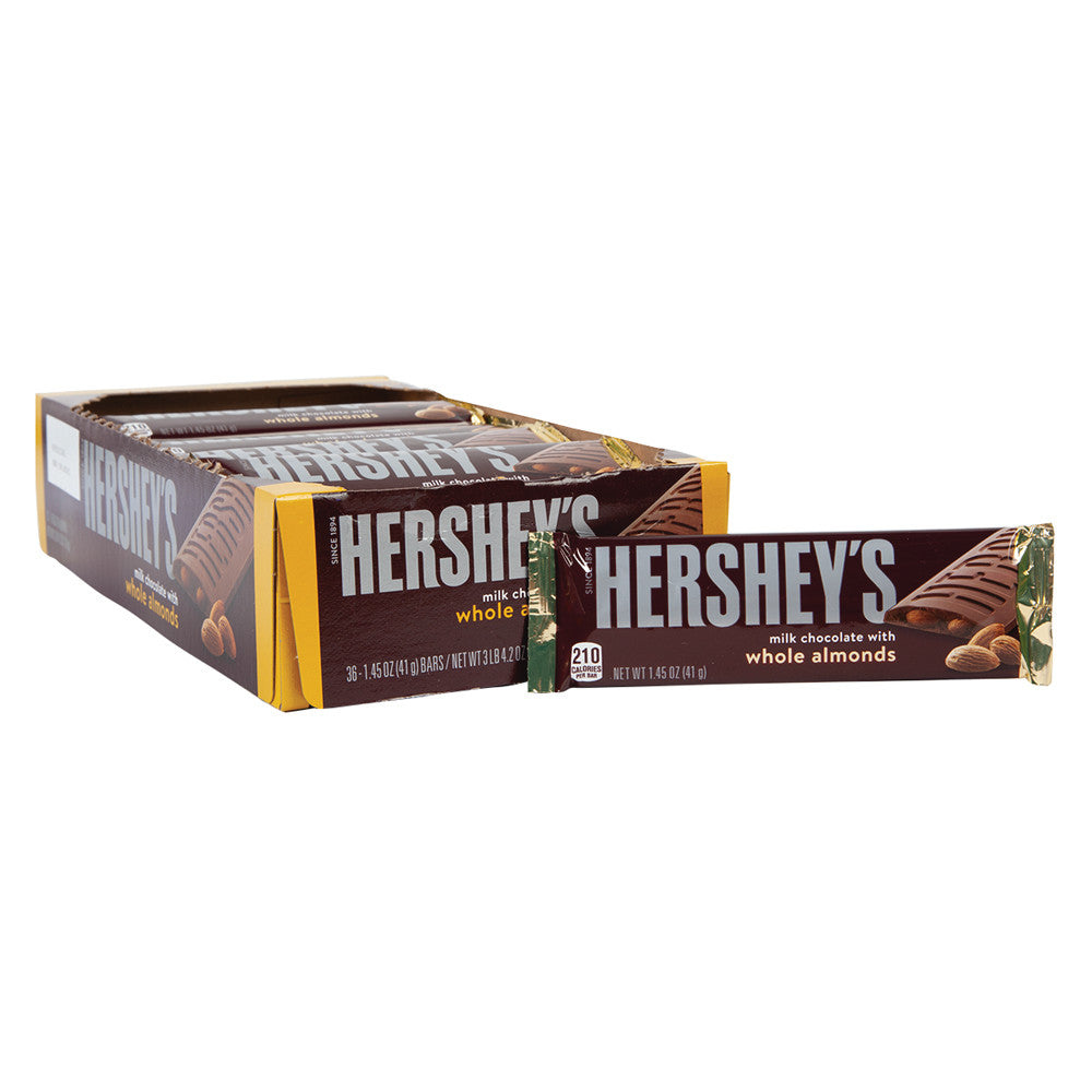 Offer your customers the delicious taste of Hershey's® milk chocolate loaded with almonds in every bite. Crafting favorite chocolate sensations that consumers seek out since 1894, these Hershey's candy bars are sure to be a hit on your candy aisles. The convenient readymade display box is great for merchandising next to other Hershey chocolate bar favorites to create the perfect upsell.