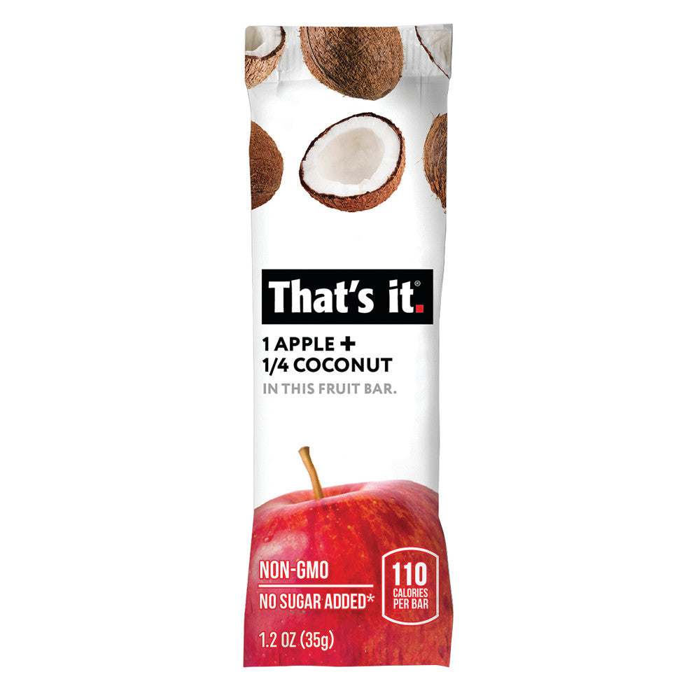 That's It is committed to providing high quality, simply made healthy snack bars. Made with exactly one apple and one quarter of a coconut per bar, That's It Apple Coconut Fruit Bars are as simple and as delicious as it can get. Free of the top eight allergens, That's It Apple Coconut Fruit Bars are a great snack for those with allergy concerns. Convenient for the on-the-go lifestyle, That's It Fruit Bars are a convenient tasty snack customers can feel good about.