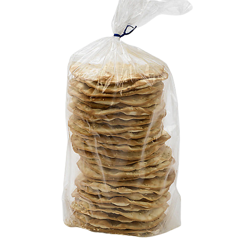 These bulk-packaged 5 Round Lahvosh Crackers by Valley Lahvosh Baking Co. feature a unique bubbly texture and a generous topping of sesame seeds. These crackers are well-suited for use as carrier crackers, making them an excellent accompaniment to robust dips and spreads. They are a delicious and versatile choice for your snacking needs.